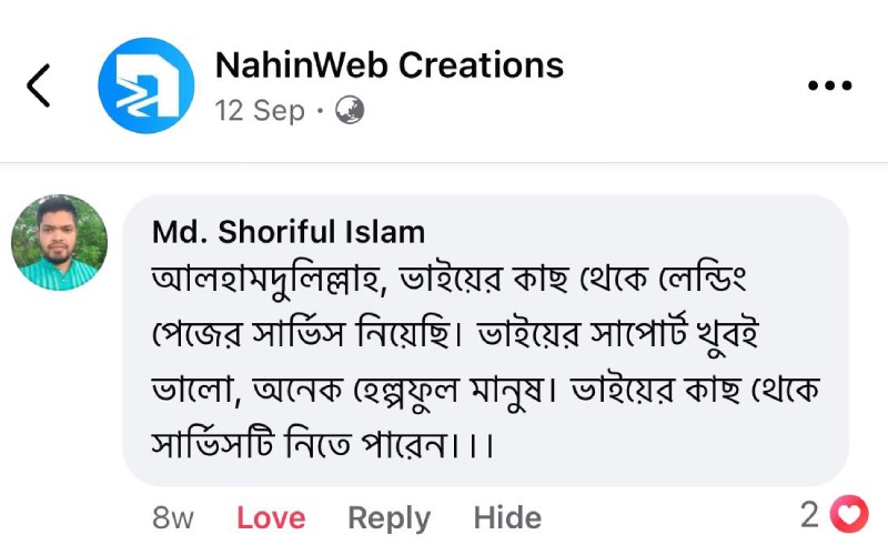আমরা একটি প্রতিশ্রুতিবদ্ধ টিম, যারা আপনার ব্যবসার জন্য প্রফেশনাল এবং আকর্ষণীয় ল্যান্ডিং পেজ ডিজাইন করে থাকি । আমাদের লক্ষ্য হলো আপনার অনলাইন উপস্থিতিকে আরো শক্তিশালী করা এবং আপনার গ্রাহকদের মুগ্ধ করা। আমাদের বন্ধুত্বপূর্ণ সাপোর্ট টিম সবসময় আপনার পাশে থাকবে, এবং advance payment ছাড়া কাজ শুরু করি এবং ৬ মাসের after sales support প্রদান করি, যাতে আপনি আমাদের উপর ভরসা রাখতে পারেন। আপনার সাফল্যই আমাদের প্রধান অগ্রাধিকার!